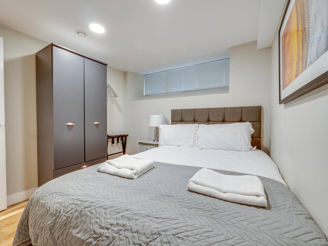 This stylish 1-bedroom flat will make you feel at home and will give you everything you will need for your perfect getaway. Тhe lounge area will provide you with a calm space to escape the hussle and bussle of the city. Comprising of a large double sofa bed, the lounge all offer a SMART TV complete with Netflix and access to YouTube, as well as super-fast internet and the latest USB wall sockets, ensuring even visitors from further afield will be able to charge those all important gadgets without the need for plugs. The apartment is also equipped with one bedroom, a full bathroom as well as all the toiletries and amenities you would need. If you prefer cooking home dishes, the well-equipped kitchen will give you the freedom & equipment to do so. Apartment built in 2019 Please note, this property is a basement apartment.